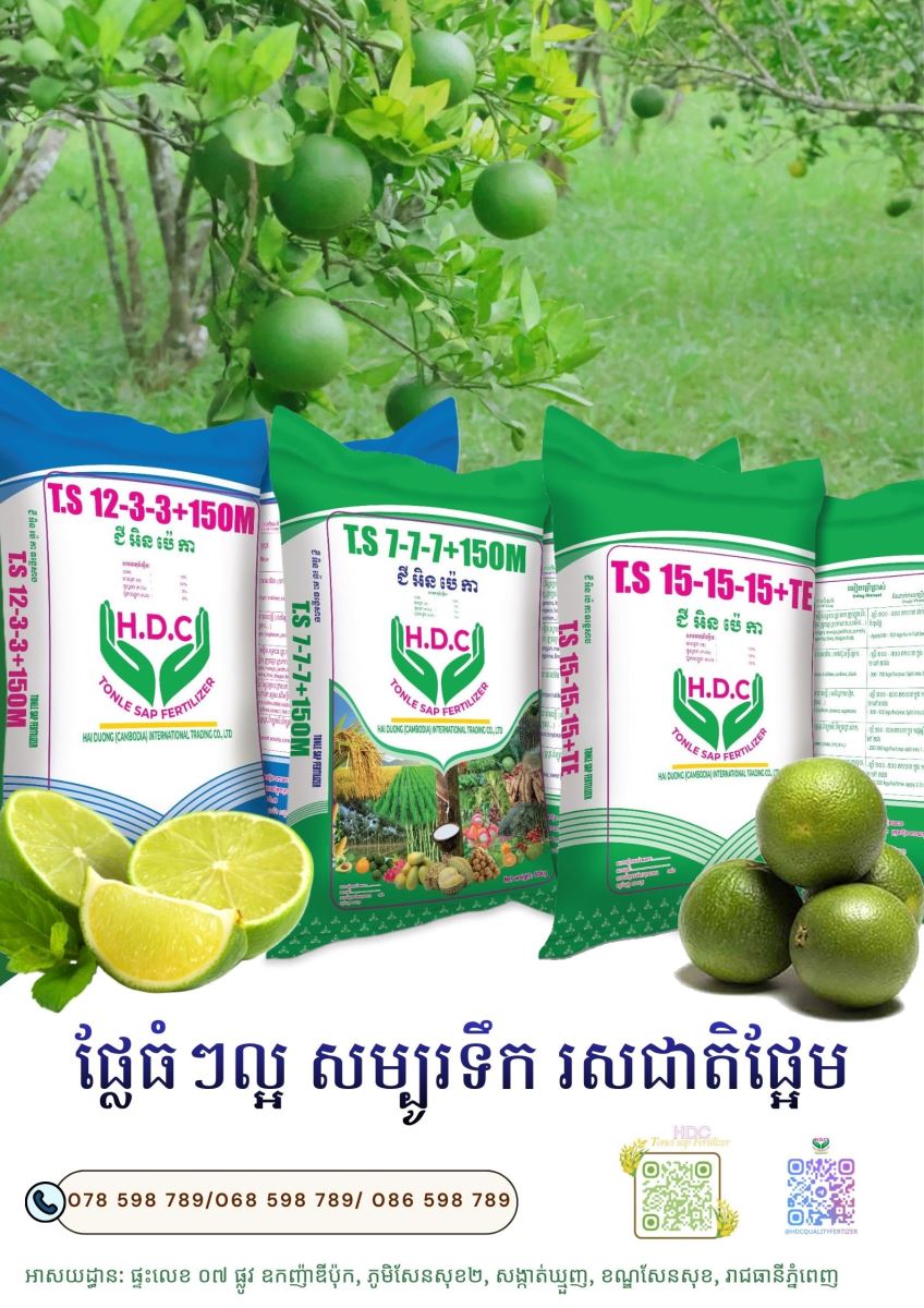 កសិកម្មកើនផល កសិករកើនចំណូល! ការជ្រើសរើសជីដែលមានគុណភាព គឺជារឿងសំខាន់សម្រាប់ប្រជាកសិករដូច្នេះហើយការប្រើប្រាស់ជី HDCជាជម្រើសដ៏ល្អដែលអាចជឿទុកចិត្តបាន។ ការដាក់ជីទៅលើប្រភេទដំណាំក្រូច: ** T.S 12-3-3+15OM ( NPK Organic Fertilizer) ចន្លោះ 1kg – 1.5kg/ 1ដើម ក្រោយប្រមូលរួច ជួយអោយដើមមានកកម្លាំង ជំនួយប្រព័ន្ធឬស ដងដើម ស្លឹកលាស់ខៀវល្អ ** T.S 7-7-7+15OM ( NPK Organic Fertilizer) ចន្លោះ 1kg – 1.5kg/ 1ដើម ជម្រុញអោយចេញផ្កា កាន់ផ្កាបានល្អ ** T.S 15-15-15+TE ( NPK Fertilizer) ចន្លោះ 1kg – 1.5kg/ 1ដើម ជំនួយដល់ផ្លែធំៗបានល្អ សាច់ក្រូចពេញល្អ សម្បូរទឹក និងរសជាតិផ្អែមឆ្ងាញ់ពិសារ។